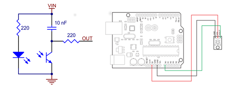 The Pololu QTR reflectance sensor carry infrared LED and phototransistor pairs that can provide analog measurements of IR reflectance, which makes them great for close-proximity edge detection and line-following applications. The modules come as compact, single-sensor units (QTR-1A) or as a bar of eight modules. We used the single sensor version.